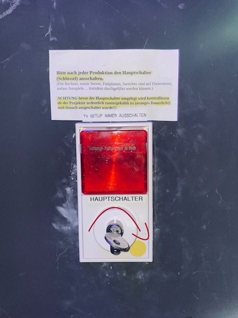 5. Monitore (XLR und Kaltgerätestecker) und Fernseher (HDMI und KGS) in das TV Rack unter der ersten Kinositzreihe einstecken.
