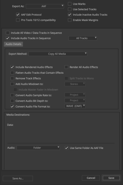 Nuendo kann aus dem MXF Format keine Meta Daten ablesen. Deswegen muss darauf geachtet werden im AAF Export auf „Convert Audio File Format to: WAVE (OMF)„ anzuklicken und auszuwählen.